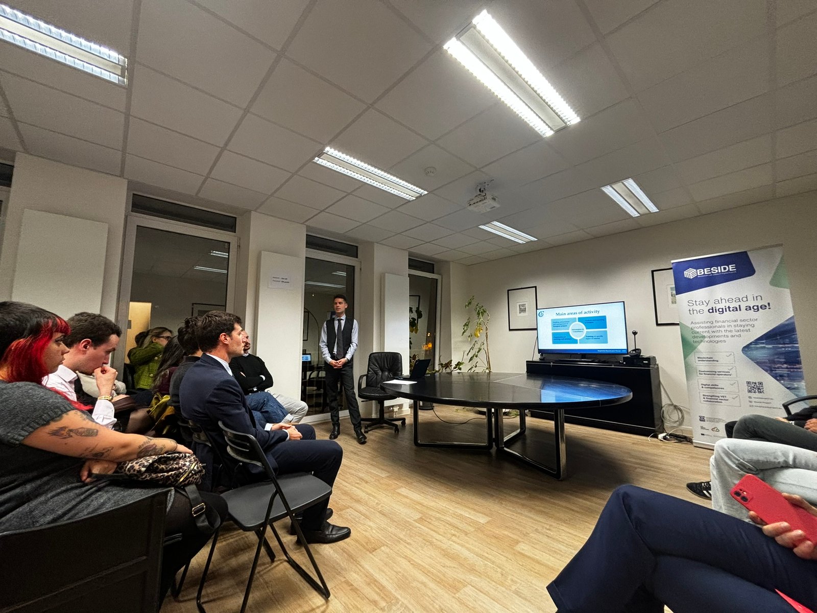 L’evento ha rappresentato un’importante occasione per approfondire gli obiettivi e i risultati del progetto Beside, con particolare attenzione al suo impatto nei settori finanziario e della formazione professionale (VET). Durante l’incontro, i partecipanti hanno avuto modo di scoprire il corso online dedicato alla tecnologia blockchain, esplorandone il funzionamento e le potenzialità applicative in diversi ambiti.